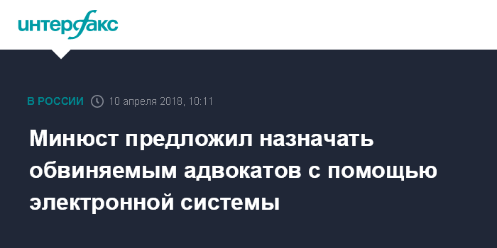 Москва. 10 апреля. INTERFAX.RU - Электронная система в ближайшем будущем будет беспристрастно назначать государственного защитника фигурантам уголовных дел. Соответствующие поправки в Уголовно-процессуальный кодекс (УПК) РФ разрабатывает министерство юстиции РФ.
