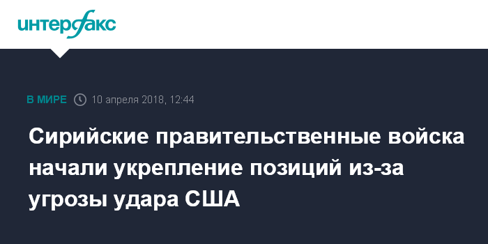 Москва. 10 апреля. INTERFAX.RU - Сирийские правительственные войска и бойцы поддерживающих их военизированных формирований находятся в состоянии повышенной готовности из-за угрозы удара США, сообщают западные СМИ со ссылкой на близких к сирийской оппозиции очевидцев.