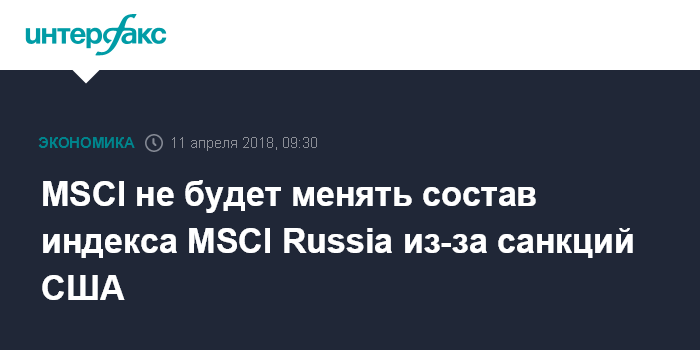 Москва. 11 апреля. INTERFAX.RU - MSCI не будет вносить изменения в состав индекса MSCI Russia в связи с введением новых санкций США против ряда российских компаний, говорится в сообщении индексного провайдера.