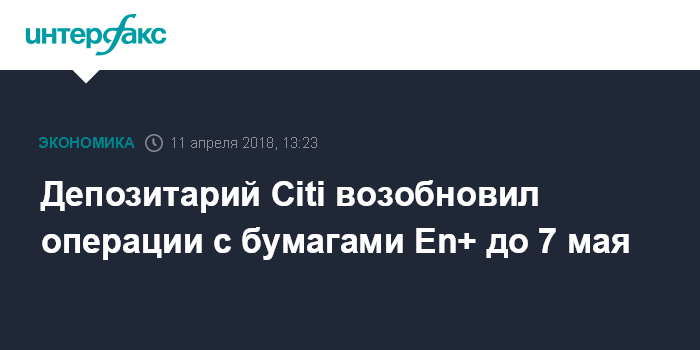 Москва. 11 апреля. INTERFAX.RU - Citi, выступающий банком-депозитарием En+ Group, возобновил операции с GDR компании до 7 мая 2018 года, сообщила компания.
