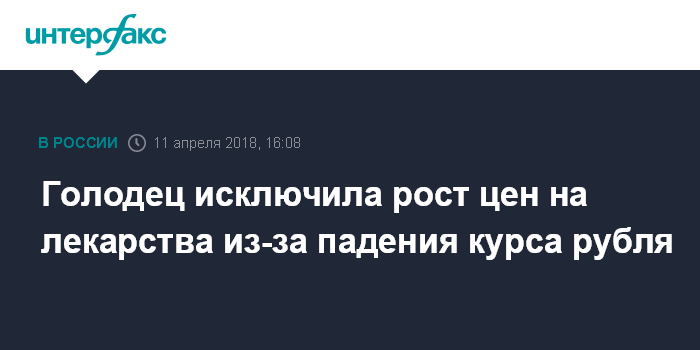 Москва. 11 апреля. INTERFAX.RU - Россиянам не стоит опасаться роста цен на импортные лекарства в связи с экономическими санкциями, которые привели в том числе к падению курса рубля, заявила вице-премьер Ольга Голодец.