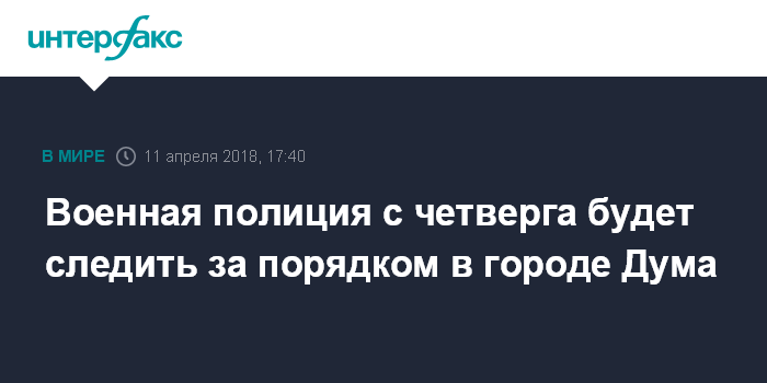 Москва. 11 апреля. INTERFAX.RU - Военная полиция с четверга введена в сирийский город Дума для поддержания порядка, заявили в российском Генштабе.