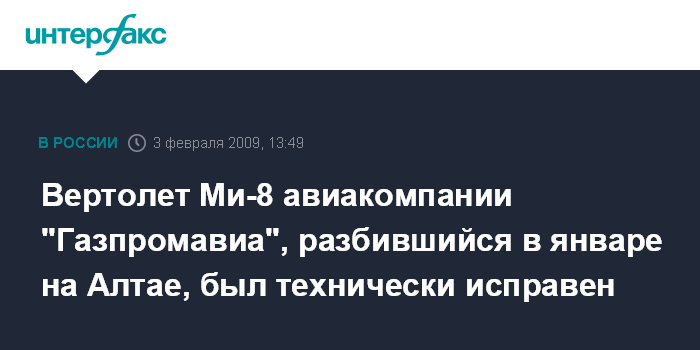 Вертолет Ми-8 авиакомпании "Газпромавиа", разбившийся в январе на Алтае, был технически исправен