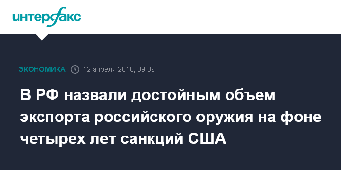 Москва. 12 апреля. INTERFAX.RU - Объем экспорта российского оружия находится на достойном уровне, несмотря на американские санкции, сообщил журналистам замглавы Федеральной службы по военно-техническому сотрудничеству (ФСВТС) России Владимир Дрожжов.