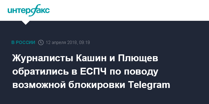 Москва. 12 апреля. INTERFAX.RU - Российские журналисты Олег Кашин и Александр Плющев обратились в Европейский суд по правам человека в связи с грозящей Telegram блокировкой.