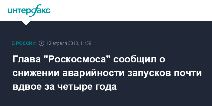 Москва. 12 апреля. INTERFAX.RU - За последние четыре года "Роскосмос" почти в два раза снизил аварийность запусков - до 4,8%, сообщил гендиректор госкорпорации Игорь Комаров.
