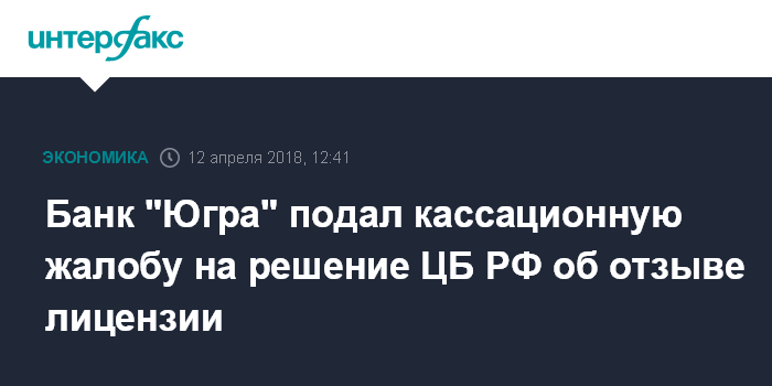 Москва. 12 апреля. INTERFAX.RU - Банк "Югра" подал кассационную жалобу на решение судов нижестоящих инстанций, признавших законным отзыв у него ЦБ РФ лицензии на осуществление банковских операций, следует из картотеки дел.
