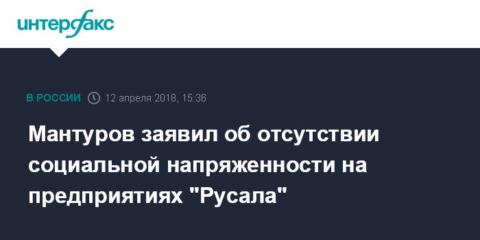 Москва. 12 апреля. INTERFAX.RU - Минпромторг РФ не ощущает социальной напряженности на предприятиях компании "Русал", попавшей под новые санкции США, заявил глава ведомства Денис Мантуров.