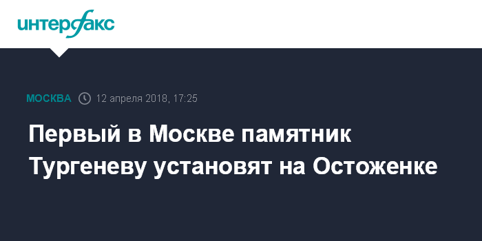 Москва. 12 апреля. INTERFAX.RU - Первый в Москве памятник русскому писателю Ивану Тургеневу будет открыт на улице Остоженка возле дома, где он жил (Дом-музей Тургенева) в сквере его имени.