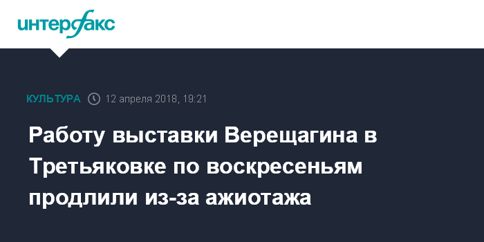 Москва. 12 апреля. INTERFAX.RU - Время работы Новой Третьяковки продлевают по воскресеньям в связи с повышенным интересом к выставке Василия Верещагина, которую за месяц посетили более 100 тыс. человек.