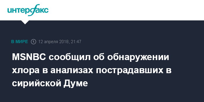 "У США есть образцы крови и мочи некоторых из пострадавших в результате атаки в Сирии на прошлых выходных, и, по данным американских официальных лиц, эти образцы дали положительные результаты на химикаты", - заявила ведущая телеканала. Она продолжила, что "в большинстве случаев это хлор", а также "нервно-паралитическое вещество".