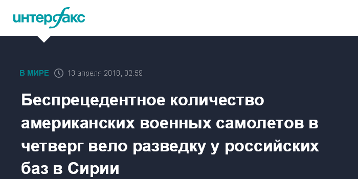 Москва. 13 апреля. INTERFAX.RU - Не менее семи американских военных самолетов, сменяя друг друга, в четверг совершили разведывательные полеты вблизи побережья Сирии, где расположены российская авиабаза Хмеймим и база материально-технического обеспечения ВМФ РФ, следует из мониторинговых данных западных авиационных ресурсов.