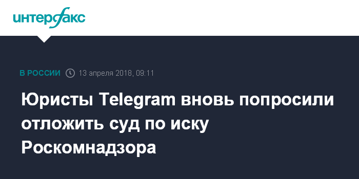 Москва. 13 апреля. INTERFAX.RU - Юристы Telegram вновь направили в Таганский суд Москвы ходатайство об отложении судебного заседания по иску Роскомнадзора о блокировке мессенджера на территории России.