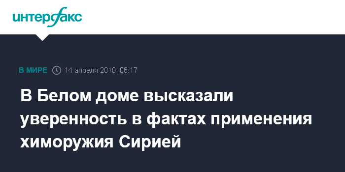 Москва. 14 апреля. INTERFAX.RU - Соединенные Штаты уверены, что 7 апреля в сирийском городе Думе было применено химическое оружие, в результате имеются многочисленные жертвы, говорится в заявлении Белого дома.