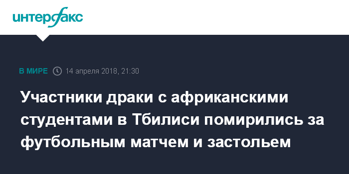 Москва. 14 апреля. INTERFAX.RU - Инцидент, произошедший в минувшее воскресенье в Тбилиси на спортплощадке на улице Белиашвили, в ходе которого местные жители устроили драку со студентами из стран Африки, исчерпан несколько часов назад состоявшимся товарищеским футбольным матчем между участниками столкновения.