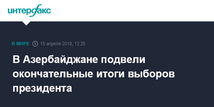 Москва. 15 апреля. INTERFAX.RU - Центральная избирательная комиссия (ЦИК) Азербайджана объявила окончательные итоги выборов президента республики, прошедшие 11 апреля 2018 года.