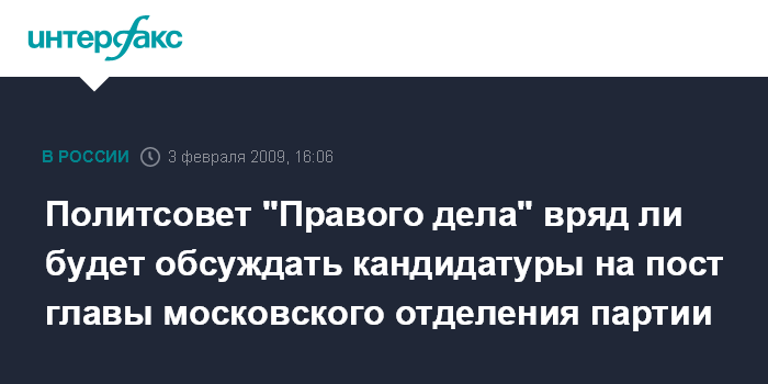 Москва. 3 февраля. INTERFAX.RU - На утро среды запланировано заседание политсовета "Правого дела", но вопрос о кандидатах на пост руководителя московского отделения партии обсуждаться на нем, вероятно, не будет.