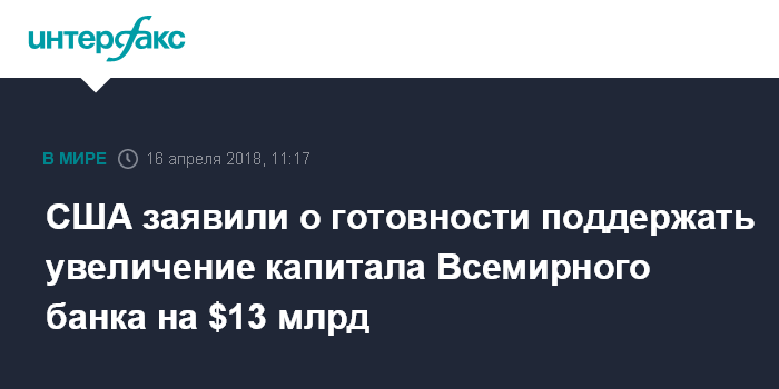 Москва. 16 апреля. INTERFAX.RU - Администрация президента США Дональда Трампа готова поддержать увеличение уставного капитала Всемирного банка (ВБ) на $13 млрд в рамках пакета мер, направленных на изменение структуры кредитования и повышение доли участия Китая, пишет The Financial Times.