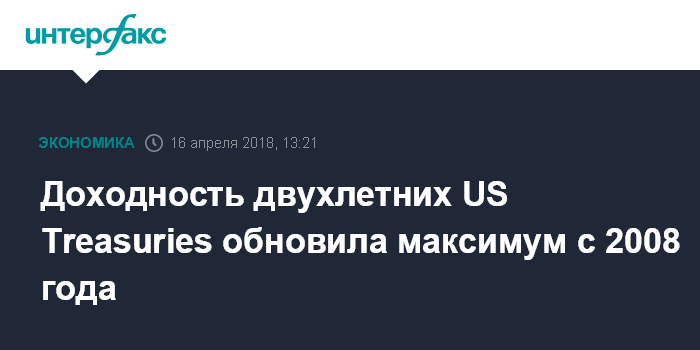 Москва. 16 апреля. INTERFAX.RU - Доходность двухлетних американских гособлигаций обновила максимум с 2008 года, распродажа US Treasuries продолжается на фоне сохранения напряженности вокруг Сирии: после авиаударов США по Сирии Москва и Вашингтон не проводили переговоров о ситуации на Ближнем Востоке, пишет Financial Times.