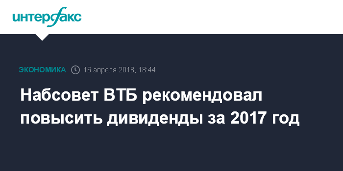 Набсовет ВТБ рекомендовал повысить дивиденды за 2017 год