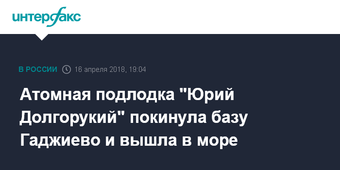 Москва. 16 апреля. INTERFAX.RU - Подводный ракетный крейсер стратегического назначения "Юрий Долгорукий" покинул главную базу подводных сил Северного флота РФ - Гаджиево, сообщили в пресс-службе флота.