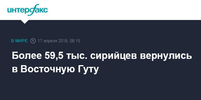 Москва. 17 апреля. INTERFAX.RU - Более 59,5 тысяч сирийцев вернулись в освобожденную от боевиков Восточную Гуту, сообщили во вторник российские военные.