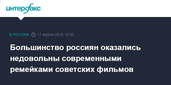Москва. 17 апреля. INTERFAX.RU - Более 70% россиян знакомы с ремейками популярных советских фильмов, в то же время около 60% из посмотревших эти картины оценивают их негативно, сообщили во ВЦИОМ.