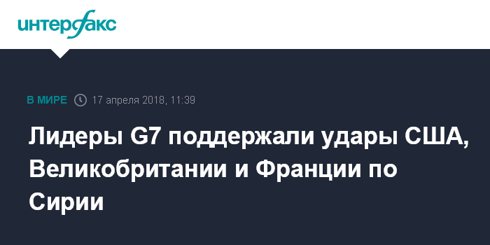 Москва. 17 апреля. INTERFAX.RU - Лидеры G7 в распространенном заявлении осудили использование химического оружия в Сирии и выразили поддержку США, Великобритании и Франции, которые ранее нанесли ракетные удары по сирийским объектам.