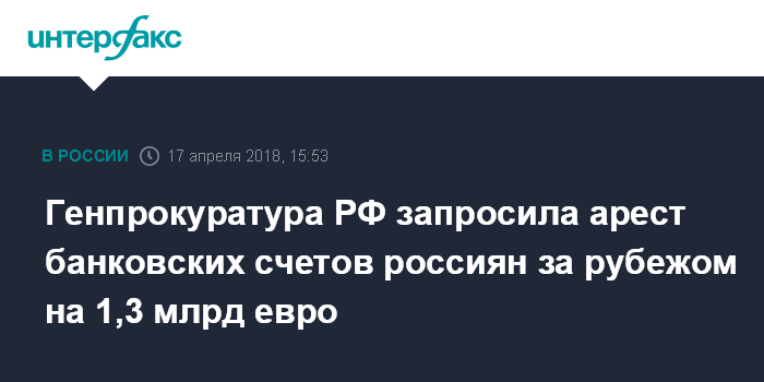 Москва. 17 апреля. INTERFAX.RU - Генпрокуратура России направила в ряд стран запросы об аресте банковских счетов подозреваемых россиян, на которых содержатся средства в общей сложности на 1,3 млрд евро.