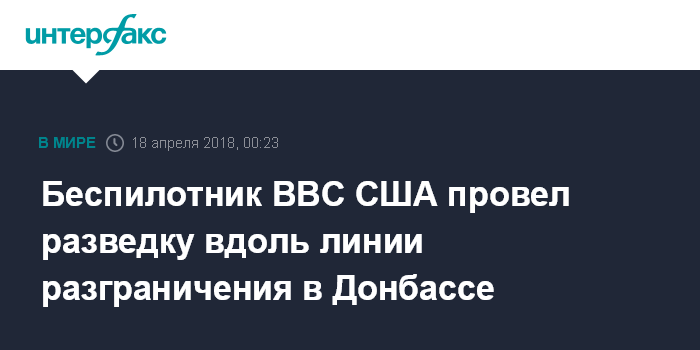 Москва. 18 апреля. INTERFAX.RU - Стратегический беспилотный летательный аппарат ВВС США RQ-4B Global Hawk после проведения во вторник днем разведки у российских рубежей на Черном море совершил очередной многочасовой полет вдоль линии разграничения в Донбассе, следует из мониторинговых данных западных авиационных ресурсов.