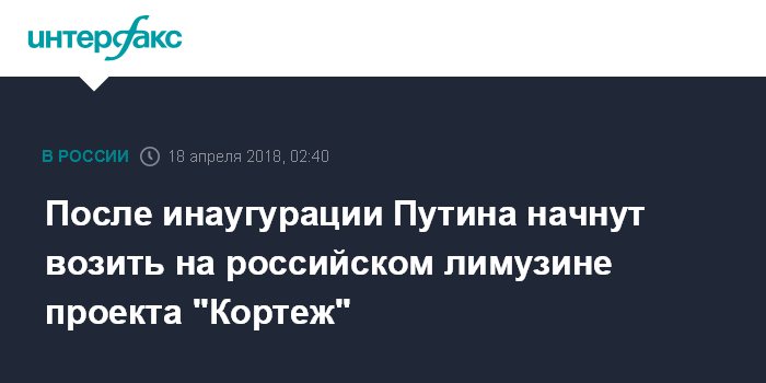 Москва. 18 апреля. INTERFAX.RU - Российский представительский автомобиль, созданный по проекту "Кортеж", начнут использовать в повседневном рабочем графике главы государства после вступления в должность, сообщает в среду газета "Известия" со ссылкой на пресс-секретаря президента РФ Дмитрия Пескова.