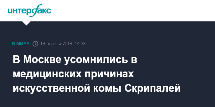 Москва. 18 апреля. INTERFAX.RU - В Москве считают, что Сергея и Юлию Скрипалей могли специально ввести в искусственную кому для того, чтобы российские специалисты не могли получить к ним доступ.
