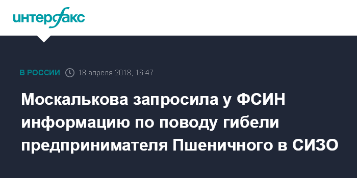 Москва. 18 апреля. INTERFAX.RU - Уполномоченный по правам человека в РФ Татьяна Москалькова обратилась в прокуратуру и ФСИН в связи с информацией СМИ об убийстве в СИЗО Петербурга бизнесмена Валерия Пшеничного, обвинявшегося в хищении.