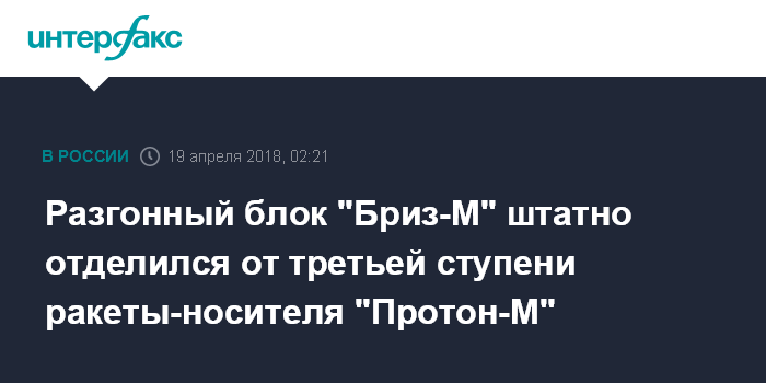 Москва. 19 апреля. INTERFAX.RU - Разгонный блок "Бриз-М" с космическим аппаратом военного назначения штатно отделился от третьей ступени ракеты-носителя "Протон-М", стартовавшей с космодрома Байконур в Казахстане, сообщили журналистам в четверг в пресс-службе Минобороны России.