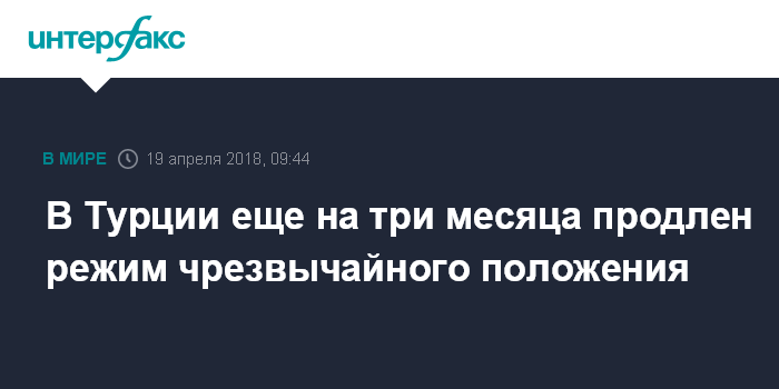 Москва. 19 апреля. INTERFAX.RU - Парламент Турции утвердил решение правительства о пролонгации режима чрезвычайного положения в стране еще на три месяца, сообщает в четверг Анатолийское агентство новостей.