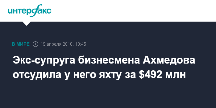 Москва. 19 апреля. INTERFAX.RU - Суд Лондона обязал российского предпринимателя Фархада Ахмедова передать в собственность экс-супруге Татьяне яхту стоимостью $492 млн в рамках бракоразводного процесса, сообщает в четверг агентство Bloomberg.