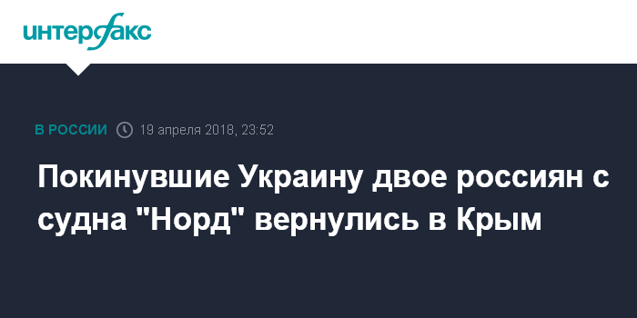 Москва. 19 апреля. INTERFAX.RU - Два моряка с арестованного на Украине крымского сейнера "Норд" вернулись в Крым, сообщил глава региона Сергей Аксенов.
