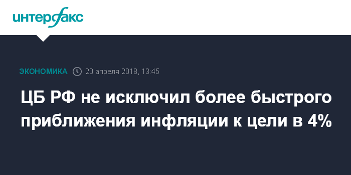 Москва. 20 апреля. INTERFAX.RU - ЦБ РФ не исключает более быстрого приближения инфляции к цели в 4%, при этом считает риск превышения этого показателя в 2018 году невысоким, говорится в комментарии Банка России по инфляции.