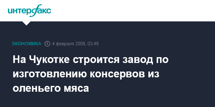 Анадырь. 4 февраля. ИНТЕРФАКС-ДАЛЬНИЙ ВОСТОК - Завод по изготовлению консервов из оленины появится на Чукотке. В Анадыре уже подобрано помещение для производства, начат монтаж оборудования.