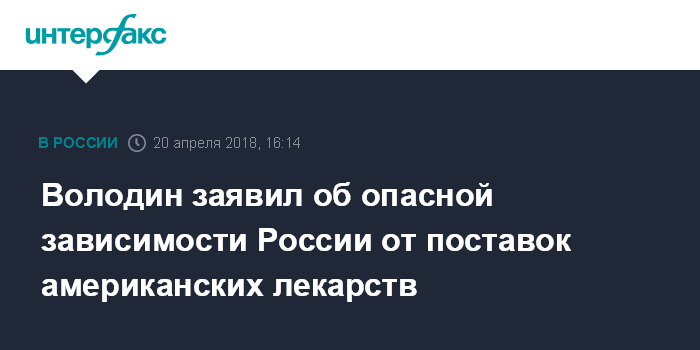 Москва. 20 апреля. INTERFAX.RU - Россия должна принять меры по насыщению рынка отечественными лекарственными препаратами, чтобы обезопасить себя от возможного прекращения из поставок в РФ из США, заявил председатель Госдумы Вячеслав Володин.