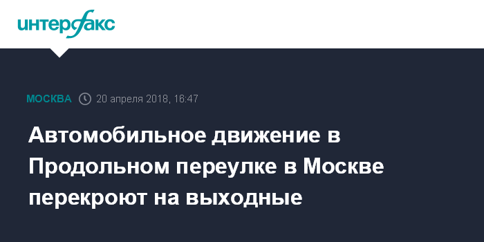 Москва. 20 апреля. INTERFAX.RU - Автомобильное движение в Продольном переулке на северо-востоке столицы будет перекрыто 21 и 22 апреля, сообщил заместитель мэра столицы по вопросам ЖКХ и благоустройства Петр Бирюков.