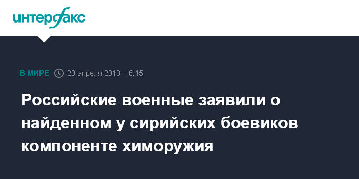 Ранее, 17 апреля, Родионов в эфире телеканала "Россия 24" (ВГТРК) заявил, что российские военные нашли в городе Дума лабораторию боевиков, где производилось химоружие.