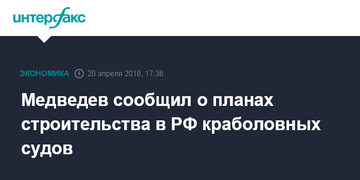 Москва. 20 апреля. INTERFAX.RU - Премьер-министр России Дмитрий Медведев рассчитывает, что в РФ в ближайшем будущем будут строиться суда для ловли крабов. На совещании по развитию рыбоперерабатывающей промышленности глава правительства сообщил о подготовке соответствующего документа.