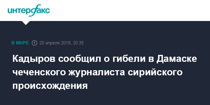 Москва. 20 апреля. INTERFAX.RU - Чеченский журналист сирийского происхождения застрелен в Дамаске, сообщил глава Чечни Рамзан Кадыров.