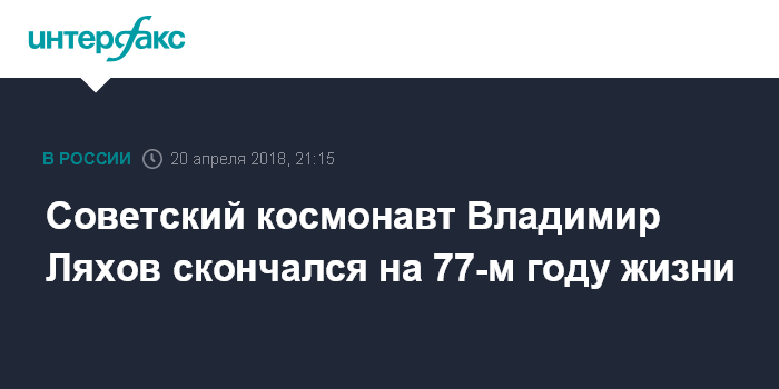 "19 апреля 2018 года на 77-м году скоропостижно ушел из жизни дважды Герой Советского Союза, летчик-космонавт СССР, полковник Владимир Афанасьевич Ляхов", - говорится в сообщении на сайте ЦПК.