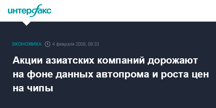 Москва. 4 февраля. INTERFAX.RU - Акции компаний Азии дорожают в среду на фоне увеличения доли автопроизводителей АТР на рынке США и роста цен на чипы памяти, сообщило агентство Bloomberg.