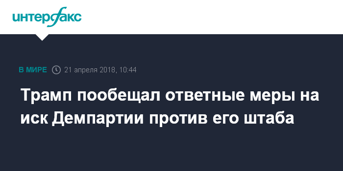 Москва. 21 апреля. INTERFAX.RU - Президент США Дональд Трамп пригрозил Демократической партии ответными действиями в связи с иском, поданным в отношении его предвыборный штаб.
