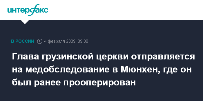 Москва. 4 февраля. INTERFAX.RU - Патриарх-католикос всея Грузии Илия Второй отправляется в среду в Германию для обследования, сообщили "Интерфаксу" в патриархии Грузии.