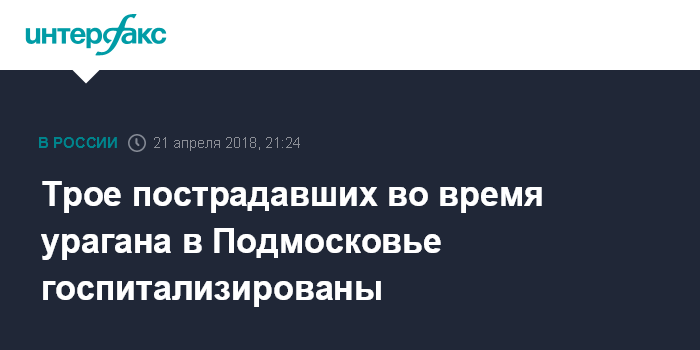Москва. 21 апреля. INTERFAX.RU - Три человека пострадали в результате ураганного ветра в субботу в Подмосковье, они госпитализированы, сообщили в пресс-службе губернатора и правительства Московской области.