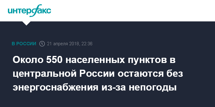 Москва. 21 апреля. INTERFAX.RU - На территории Владимирской, Ивановской, Тверской, Смоленской, Рязанской, Московской и Тульской областей без энергоснабжения остаются около 550 населенных пунктов с населением около 45 тысяч человек, сообщили в пресс-службе Центрального регионального центра (ЦРЦ) МЧС.